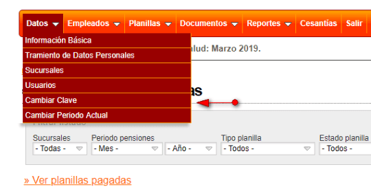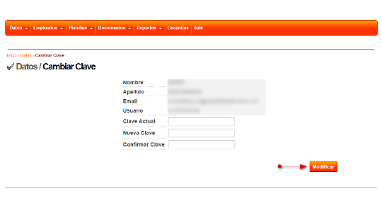 Cuando desee cambiar la clave con la cual ingresa al sistema, debe hacerlo una vez haya ingresado con su usuario y clave actual y luego dirigirse a la opción Datos > Cambiar clave. El sistema le solicitará clave actual y la nueva clave, seguido haga clic en el botón Modificar.