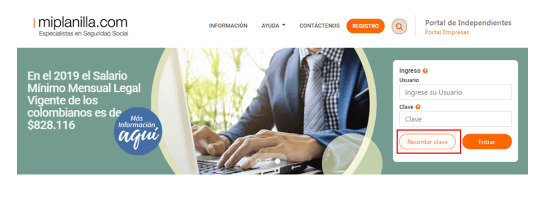Si desea gestión más inmediata para este procedimiento, puede dirigirse al vínculo Recordar clave ubicado junto a las casillas de texto donde se escriben los datos que permiten el ingreso al sistema. Desde allí será direccionado a una pantalla donde deberá ingresar el usuario con el que está registrado en miplanilla.com (compuesto por las dos letras mayúscula correspondientes al tipo de identificación seguidas del respectivo número) como también la dirección de correo electrónico con la cual se registró en miplanilla.com. Si no recuerda estos datos, solicite atención telefónica o solicite ayuda desde la opción Contáctenos.
