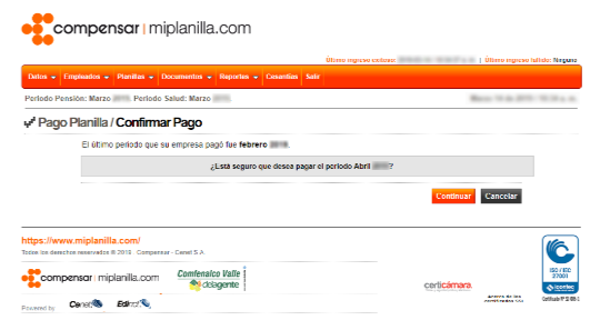 Una vez la planilla ha sido generada, miplanilla.com lleva a cabo una validación donde se corrobora que el pago a efectuar se ajuste al periodo a liquidar. De esta forma señalará el correspondiente al último pago que la empresa o persona canceló. Si no coincide con el consecutivo aparecerá un mensaje que permitirá al usuario confirmar el pago que va a realizar.