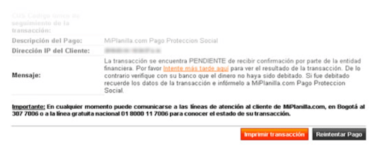 Si la transacción no fue terminada en su totalidad, el sistema le mostrará un mensaje informando el estado de la transacción. Posteriormente podrá visualizar un mensaje de confirmación estableciendo como pendiente el estado.